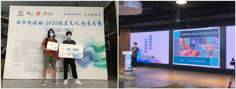 北京文化创意大赛石景山区分赛场自启动以来,面向全市征集优秀项目,征集领域含文化科技融合、数字创意、创意设计、非遗及IP开发、文化旅游、文化体育、广告传媒、文创类初创项目等多个领域,常规赛制共有150个项目报名参赛。组委会在对150个项目开展项目审核、选拔过后,共有50个项目进入复赛。8月6日、7日开展为期两天的复赛,经过严格的专家评审打分,24个优秀项目脱颖而出进入决赛。8月10日,太阳成官网澳门太阳成集团艺术设计系2017级本科生夏欣宇、卢頔代表创业团队,赴首钢·侨梦苑参加了现场项目路演和颁奖仪式。